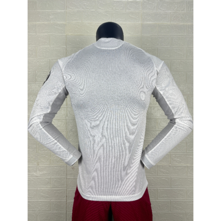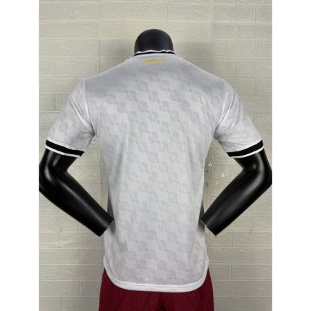 Il design di questa stagione unisce tradizione ed innovazione in modo impeccabile. Il tessuto è arricchito da una trama raffinata con motivo pied de poule, all’interno del quale si nascondono le iniziali “RM” – un dettaglio sottile ma carico di identità. Il colletto a V richiama le divise storiche, mentre i tocchi neri a contrasto donano alla maglia un tocco elegante e deciso.