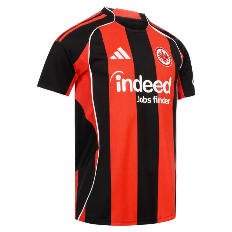 La maglia ufficiale da casa dell’Eintracht Frankfurt per la stagione 2025/26 segna il ritorno alle iconiche strisce rosse e nere, reinterpretate da adidas con il nuovo colore “SGE Red” esclusivo per il club. Il design si ispira ai kit degli anni 2000, in particolare al template Tiro del 2006, con un look moderno ed energico: collo e maniche sono completamente neri, mentre il piping bianco lungo i fianchi e il collo aggiunge un tocco di freschezza e dinamismo.