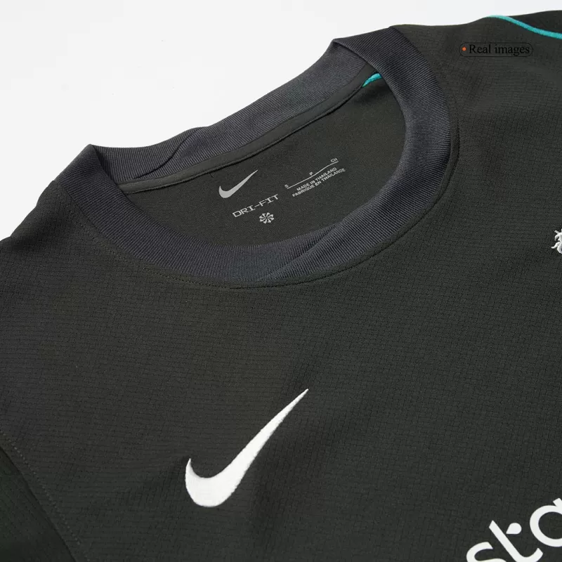 La nuova maglia away del Liverpool FC per la stagione 2024/25 celebra lo stile retrò con un tocco moderno. Dominata da una sofisticata tonalità “Night Forest” (verde bosco), è impreziosita da dettagli in grigio antracite, teal slavato e avorio, ispirati ai kit iconici degli anni ‘90.