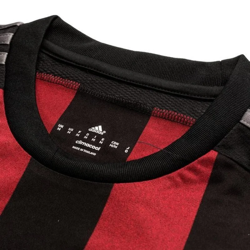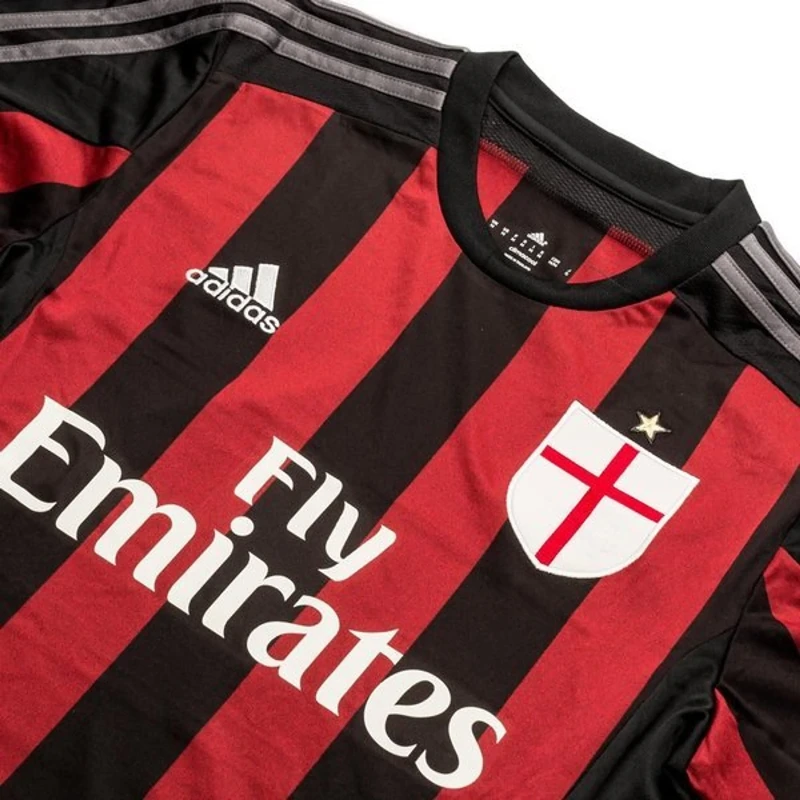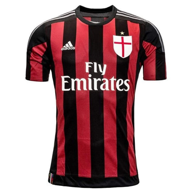 La maglia home dell’AC Milan per la stagione 2015-16 rappresenta un connubio tra tradizione e modernità. Il design classico a strisce verticali rosse e nere richiama la storia gloriosa del club, mentre i dettagli contemporanei, come il colletto a V e il logo Adidas, conferiscono un tocco di freschezza e innovazione. Il logo “Fly Emirates” sul petto testimonia la continua partnership con il noto sponsor.