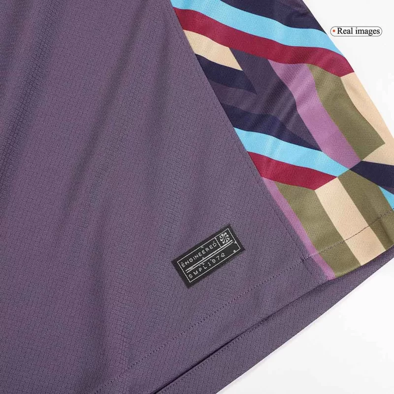 La maglia si distingue per la sua colorazione Marrone Chiaro, arricchita da pannelli laterali multicolore con ben sette tonalità differenti, che aggiungono un tocco energico e audace al look. Il dettaglio dorato su logo e stemma “Three Lions” enfatizza l’eleganza e l’unicità del design.