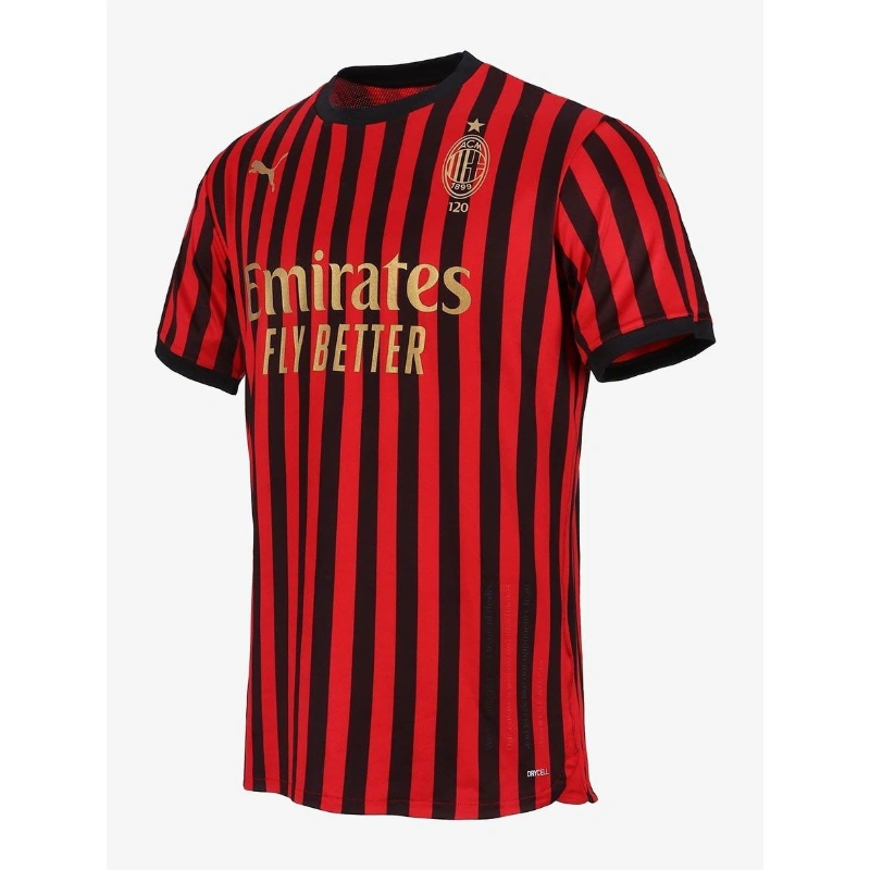 Questa maglia celebrativa del 120º anniversario dell’AC Milan è molto più di una semplice divisa da gara: è un simbolo della storia rossonera. Lanciata nel 2019 in edizione limitata, presenta le iconiche strisce verticali rosse e nere, impreziosite dallo stemma dorato e dal logo “Emirates Fly Better” sul petto.
