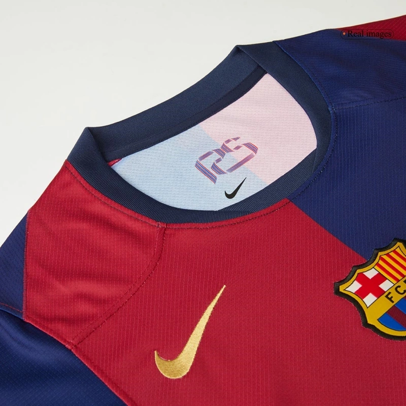 La nuova maglia home del Barcellona 2024/25 celebra il 125º anniversario del club con uno stile audace ed elegante. Il design presenta due ampie strisce verticali blu e granata, unite centralmente dallo stemma del Barça. Le maniche riprendono gli stessi colori, mentre il retro del colletto è impreziosito dai colori della bandiera catalana, un omaggio alle radici del club.