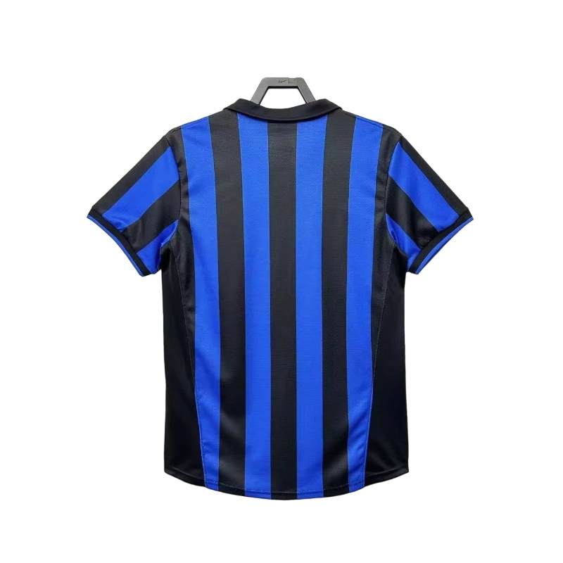 La maglia casalinga dell’Inter del 1998-1999 è un perfetto esempio dello stile nerazzurro degli anni ’90. Caratterizzata da righe verticali nero e blu più larghe del solito, questa maglia evoca il periodo di transizione tra l’epoca di Ronaldo e quella della nuova generazione.