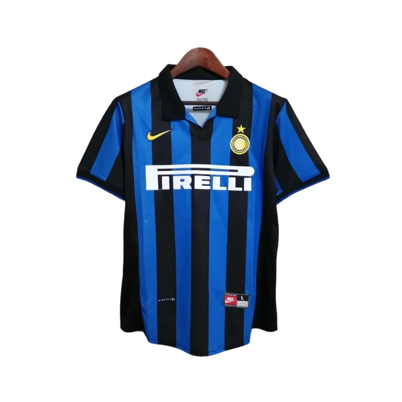 Maglia home Inter 98-99 con righe classiche e sponsor Pirelli d’epoca