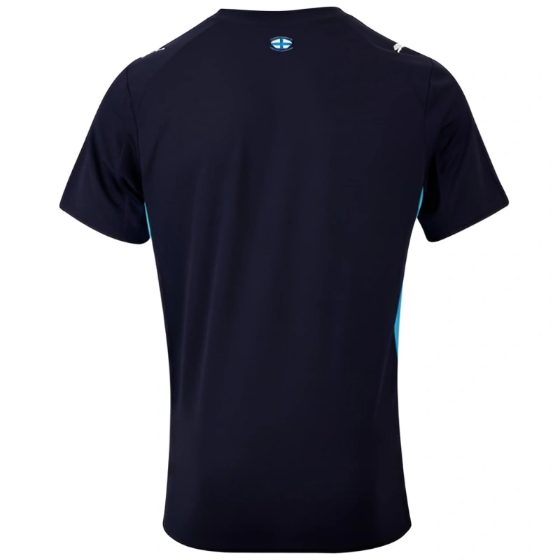 La maglia da calcio Olympique Marsiglia trasferta 2025-2026 si distingue per il suo design elegante e audace, dominato dal colore nero intenso con dettagli blu che richiamano la tradizione del club francese.