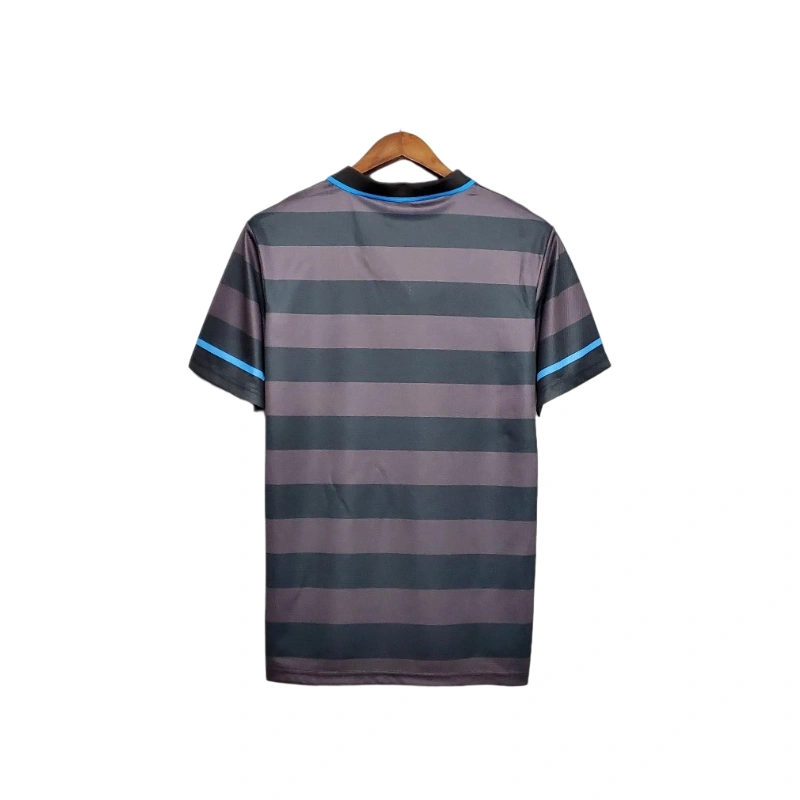 La maglia da trasferta vintage dell’Internazionale stagione 1997-1998 è un’icona storica per i tifosi nerazzurri. Caratterizzata da righe orizzontali nere e marroni che creano un contrasto unico e raffinato, questa divisa incarna lo spirito degli anni ’90 e il leggendario periodo di Ronaldo “Fenomeno”.