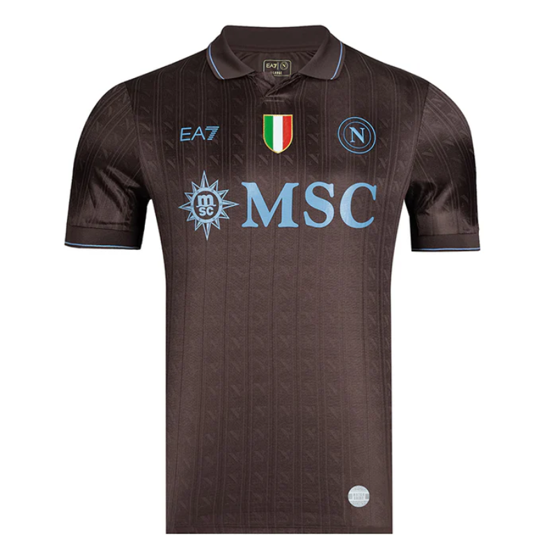 La maglia gara SSC Napoli 2025/26 terza, conosciuta anche come “Caffè”, celebra l’identità partenopea con un design elegante e innovativo. Il colore caffè, ispirato al celebre caffè napoletano, rappresenta un omaggio alla tradizione e alla cultura della città. Il colletto in stile polo, rifinito con bordi azzurri vintage, aggiunge un tocco di classe, mentre il logo del club e gli sponsor sono realizzati in tonalità azzurre, richiamando i colori storici della squadra.
