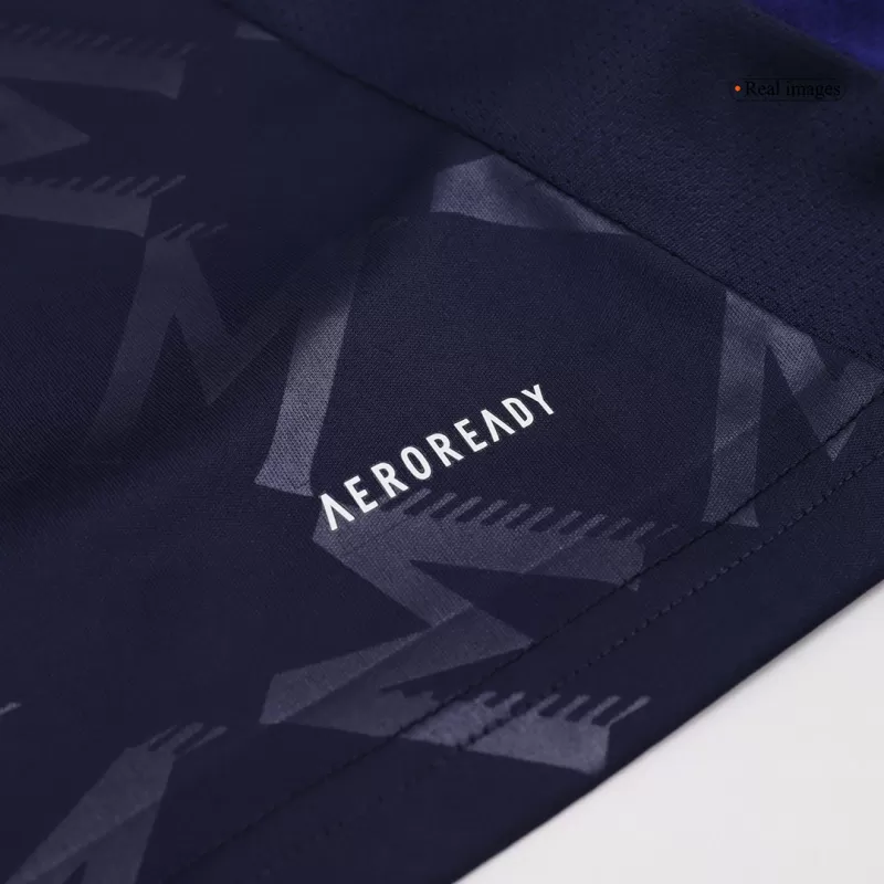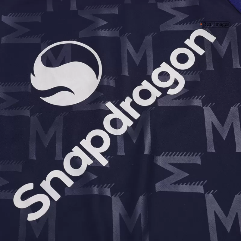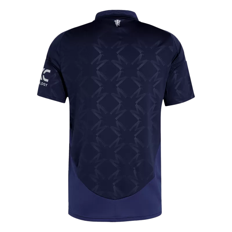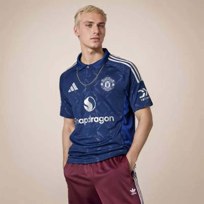 Un motivo zig-zag su tutta la parte anteriore, basato su una “M” stilizzata, dona profondità visiva. Il colletto presenta tre linee blu, simbolo dei tre fiumi che attraversano la città, incluso quello che collega Manchester a Old Trafford. Un tributo autentico alle radici del club.