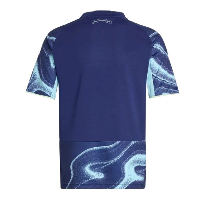 La maglia presenta un elegante colore blu notte, arricchita da un motivo ondulato in tonalità azzurre che richiama le acque di Amsterdam. I dettagli in fluo verde sui bordi del colletto, delle maniche e dei pantaloncini aggiungono un tocco moderno e dinamico. Il logo dell’Ajax e lo stemma sono ben visibili, rendendo ogni bambino parte della squadra anche lontano dallo stadio.