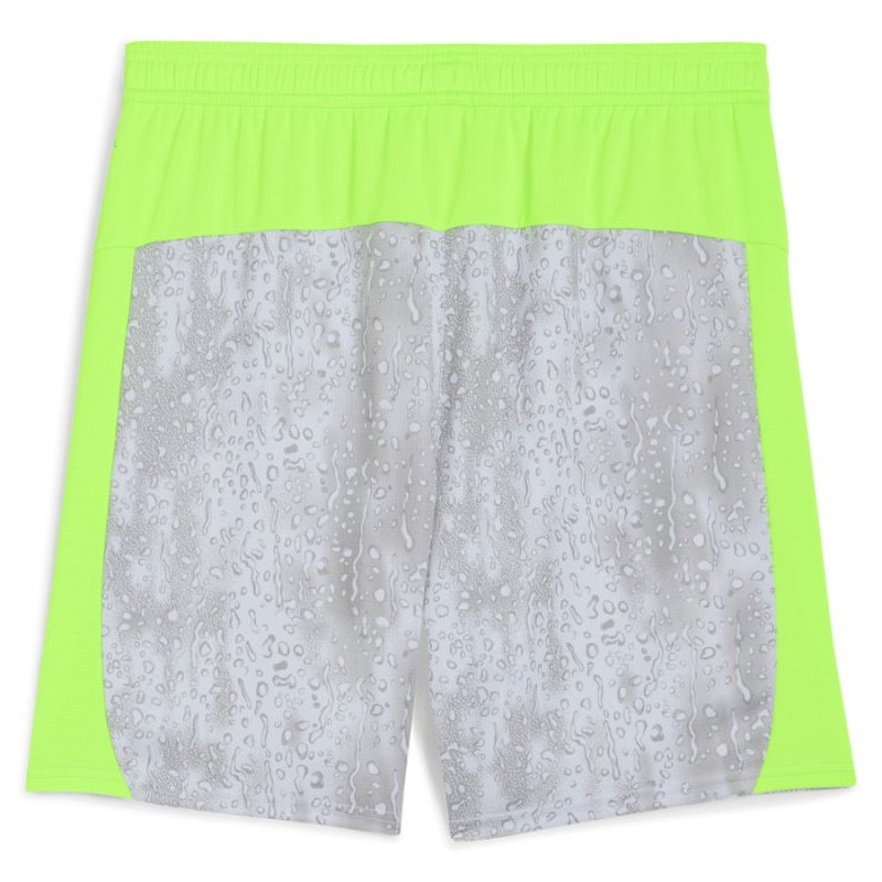 Il design presenta una base grigio acciaio con stampa a gocce d’acqua su maglia e pantaloncini, creando un effetto visivo moderno e dinamico. I dettagli in verde neon sul colletto, sulle spalle e sui pannelli laterali aggiungono un contrasto vivace, simbolo dell’energia dei giovani campioni.