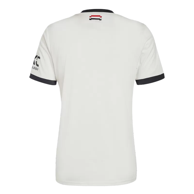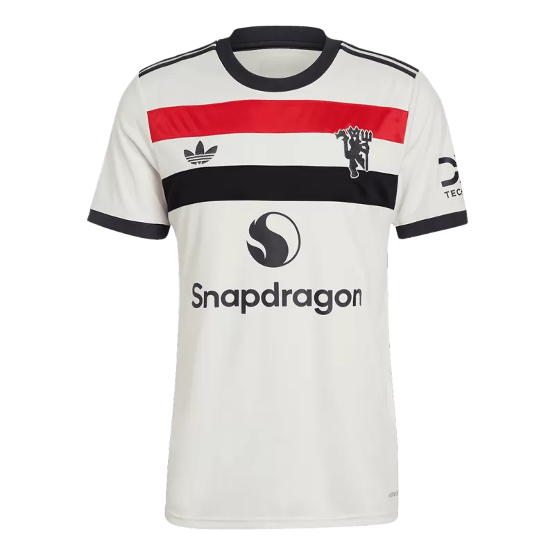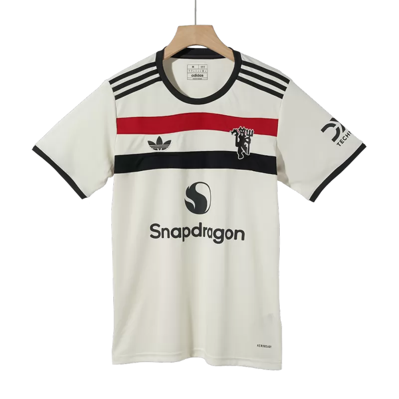 Un omaggio agli anni ’90: la nuova terza maglia del Manchester United combina stile retrò, dettagli moderni e passione per il calcio inglese. La terza maglia 2024/25 del Manchester United prende ispirazione dai kit iconici degli anni ’90. La base bianca è attraversata da strisce orizzontali rosse e nere sul petto, accompagnate da un badge minimalista del Red Devil.